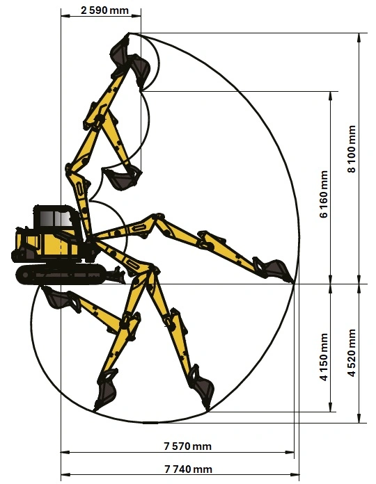 - Sokoldalú gémgeometria: A plusz csukló lehetővé teszi, hogy a gép közvetlenül a lánctalp mellett ásson, a csuklógémes kialakításnak köszönhetően a gép 8100 mm-es maximális ürítési magasságra képes, miközben a függőleges falú árkokat is precízen mélyíti. Ideális városi közműépítésekhez és szűk munkagödrökhöz.