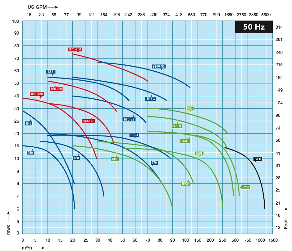 | Típus | Szállítás [m3/h] | Emelési magasság [m] | ø [mm] | Csatlakozás | kW | Rpm | |