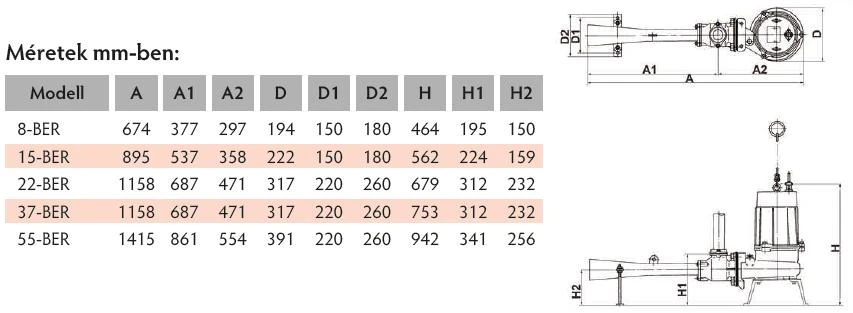 Ezt a típusú merülőszivattyút egy B-típusú pumpa és egy légszivattyú (szívómechanizmus) alkotja, vagyis mind a keverés, mind a levegőztetés egyszerre működhet. A BER levegőztetők jellemzője a rendkívül magas oxigénbontó képesség és az eltömődés elleni vágómechanizmus.